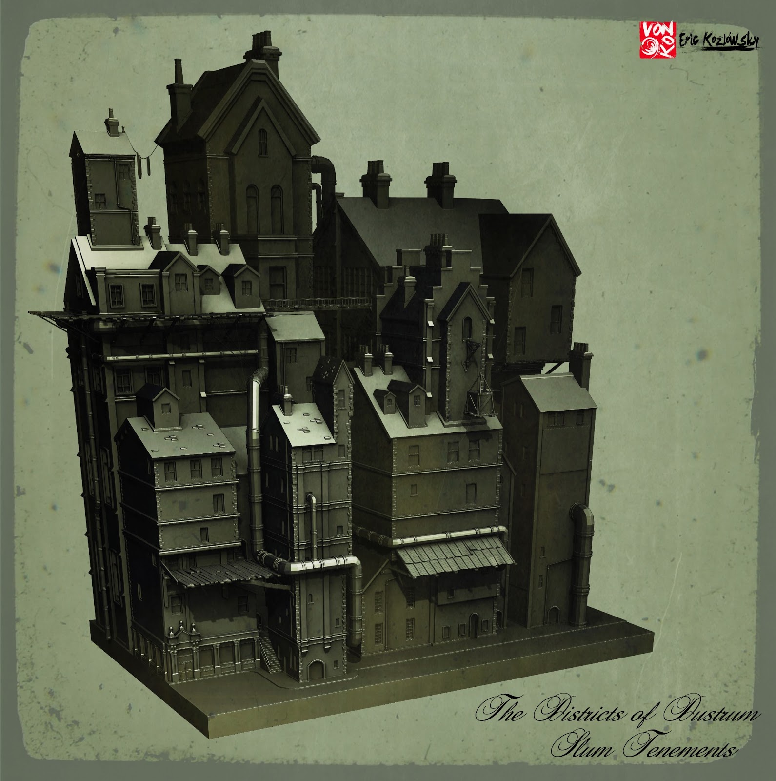 Here is my interpretation of it. I changed up some proportions and shapes based on spatial relationships and inconsistencies in the concept (basically the distance between buildings).
